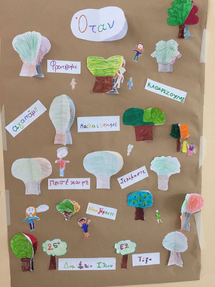 Στο πλαίσιο των Εργαστηρίων Δεξιοτήτων, και συγκεκριμένα στη θεματική ενότητα «Προστατεύω το περιβάλλον», οι μαθητές συσχέτισαν τις πυρκαγιές στα δάση με τα πλημμυρικά φαινόμενα. Αρχικά, αποτύπωσαν με ζωγραφική τον τρόπο με τον οποίο μια πλημμύρα δυσκολεύει και καθιστά επικίνδυνη τη ζωή των ανθρώπων και των ζώων, τόσο στις πόλεις όσο και στα χωριά, και δημιούργησαν αφίσα με τίτλο «Έγινε στάχτη το όνειρο και η βροχή πλημμύρα…». Κατόπιν, συνειδητοποίησαν τον βαθμό που οι καταστροφικές πυρκαγιές, όπως αυτές στη Βόρεια Εύβοια το περασμένο καλοκαίρι, αυξάνουν την πιθανότητα πλημμυρικών φαινομένων. Τέλος, πρότειναν λύσεις για την αποφυγή τους, αφού είχαν ήδη έρθει σε επαφή με τον εθελοντισμό, τη διαμεσολάβηση και την κοινωνική ευθύνη στην προηγούμενη θεματική ενότητα των Εργαστηρίων Δεξιοτήτων «Ενδιαφέρομαι και Ενεργώ». Δημιούργησαν «διαδραστική» αφίσα με τίτλους «Όταν» και «Αν δεν». Στην αφίσα υπήρχαν διπλά δέντρα, ένα πράσινο κι ένα καμένο, και λέξεις όπως: φροντίζουμε, αγαπάμε, μαθαίνουμε, προσέχουμε, σεβόμαστε και νοιαζόμαστε. Στον τίτλο «Όταν» τα δέντρα είναι πράσινα και στον τίτλο «Αν δεν» είναι καμένα.