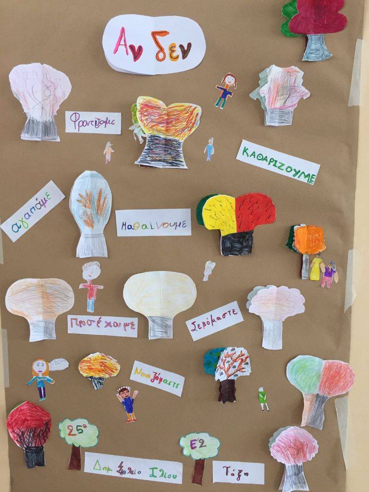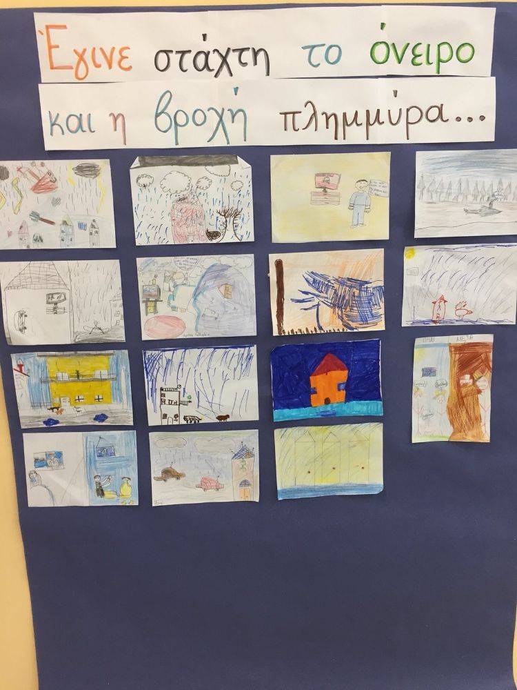 Στο πλαίσιο των Εργαστηρίων Δεξιοτήτων, και συγκεκριμένα στη θεματική ενότητα «Προστατεύω το περιβάλλον», οι μαθητές συσχέτισαν τις πυρκαγιές στα δάση με τα πλημμυρικά φαινόμενα. Αρχικά, αποτύπωσαν με ζωγραφική τον τρόπο με τον οποίο μια πλημμύρα δυσκολεύει και καθιστά επικίνδυνη τη ζωή των ανθρώπων και των ζώων, τόσο στις πόλεις όσο και στα χωριά, και δημιούργησαν αφίσα με τίτλο «Έγινε στάχτη το όνειρο και η βροχή πλημμύρα…». Κατόπιν, συνειδητοποίησαν τον βαθμό που οι καταστροφικές πυρκαγιές, όπως αυτές στη Βόρεια Εύβοια το περασμένο καλοκαίρι, αυξάνουν την πιθανότητα πλημμυρικών φαινομένων. Τέλος, πρότειναν λύσεις για την αποφυγή τους, αφού είχαν ήδη έρθει σε επαφή με τον εθελοντισμό, τη διαμεσολάβηση και την κοινωνική ευθύνη στην προηγούμενη θεματική ενότητα των Εργαστηρίων Δεξιοτήτων «Ενδιαφέρομαι και Ενεργώ». Δημιούργησαν «διαδραστική» αφίσα με τίτλους «Όταν» και «Αν δεν». Στην αφίσα υπήρχαν διπλά δέντρα, ένα πράσινο κι ένα καμένο, και λέξεις όπως: φροντίζουμε, αγαπάμε, μαθαίνουμε, προσέχουμε, σεβόμαστε και νοιαζόμαστε. Στον τίτλο «Όταν» τα δέντρα είναι πράσινα και στον τίτλο «Αν δεν» είναι καμένα.